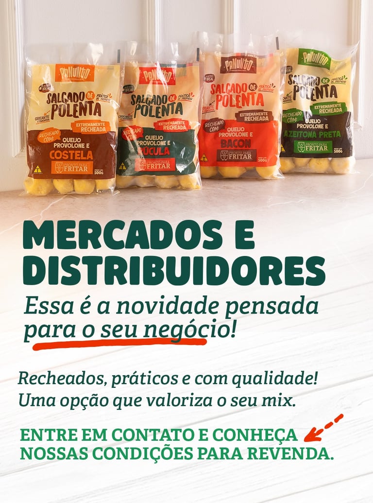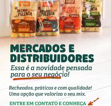 Feitos com ingredientes selecionados e uma receita exclusiva, nossos Salgados de Polenta são a escolha ideal para supermercados, bares, restaurantes, empórios e distribuidoras.